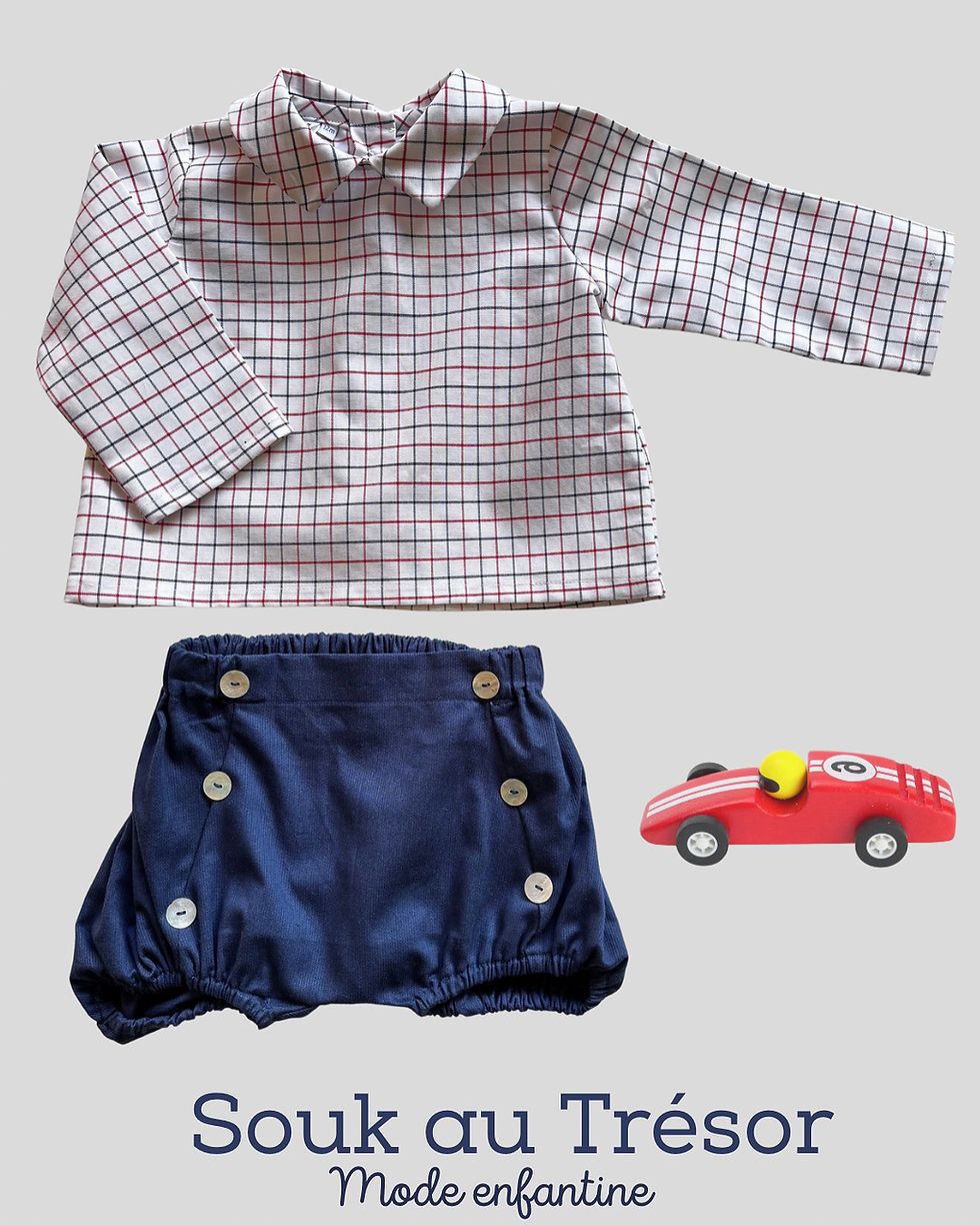 Vous retrouverez les pièces phares de Souk au Trésor comme les culottes bouffantes, barboteuses, gilets de berger, bloomer, guimpes...dans des tissus comme le Liberty, le vichy et la rayure.